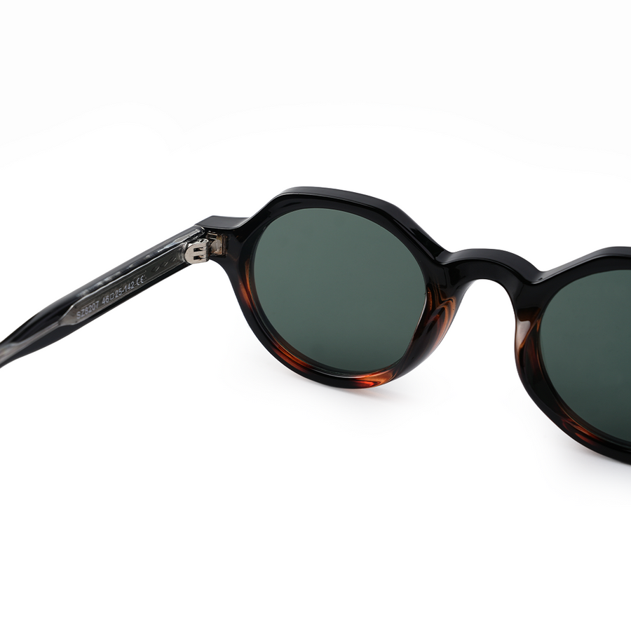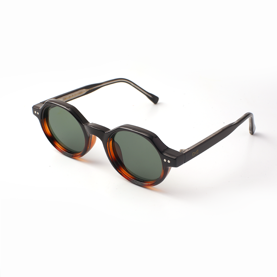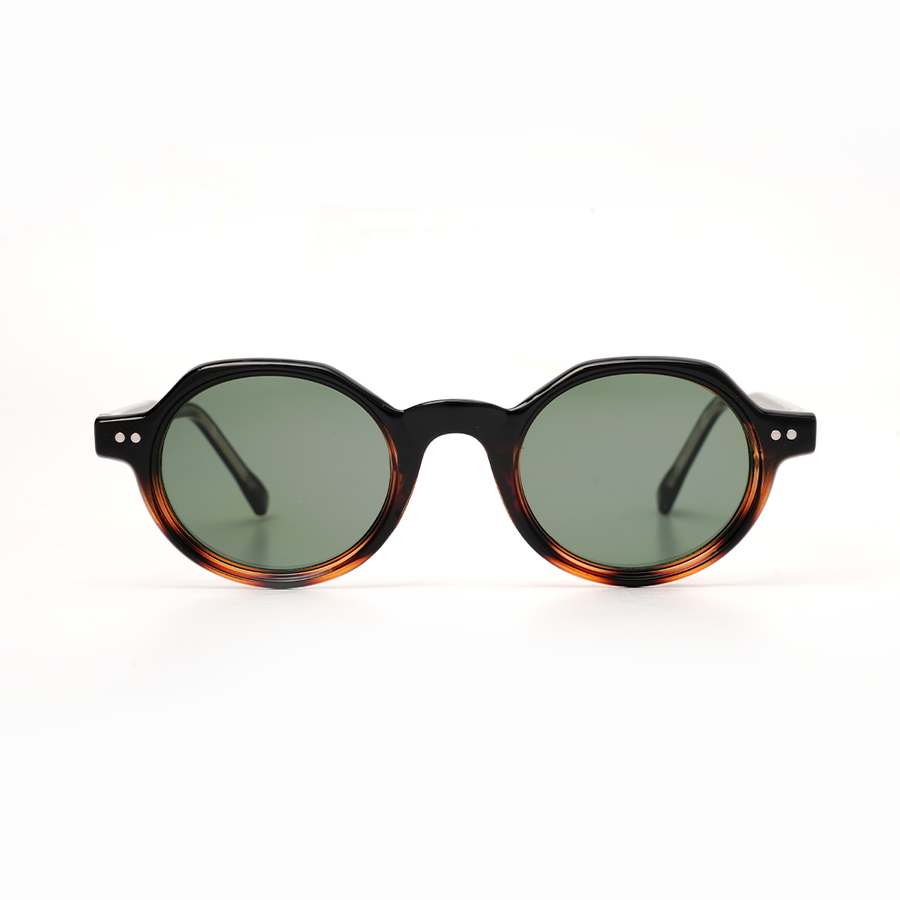 The is a bold reinterpretation of the classic round frame. Its black-to-tortoiseshell gradient acetate gives it a timeless vintage feel with a modern twist, making it versatile for both casual and statement looks. The green UV400 lenses balance elegance with practicality, while the dual rivet accents enhance its retro appeal.