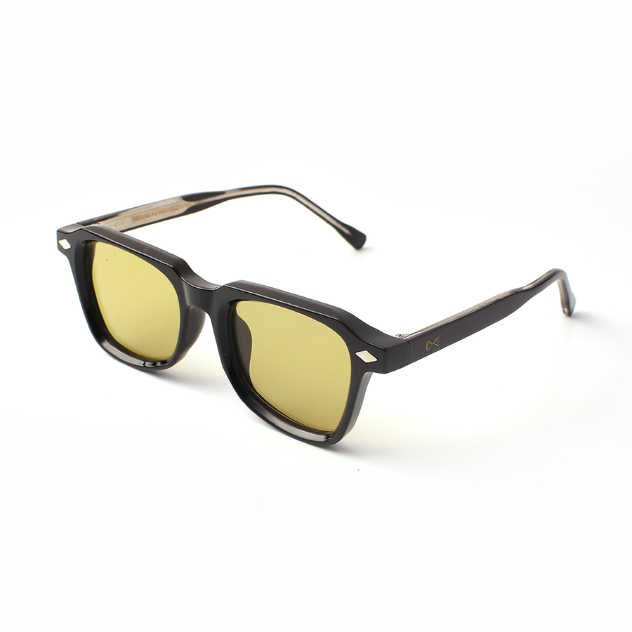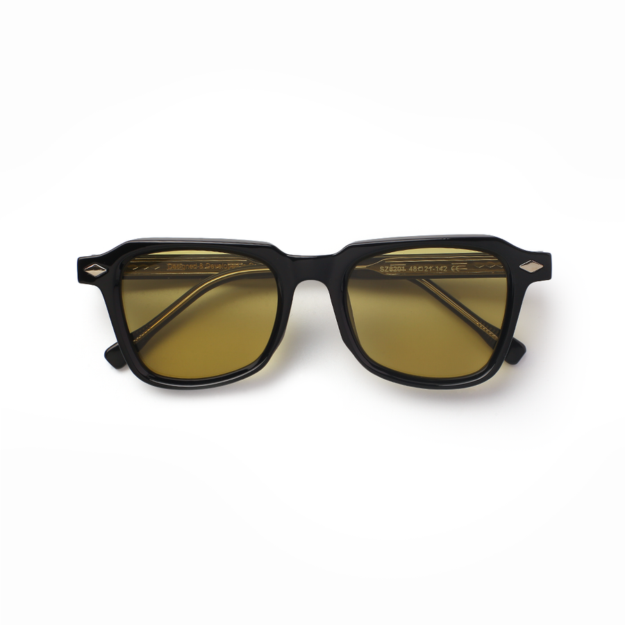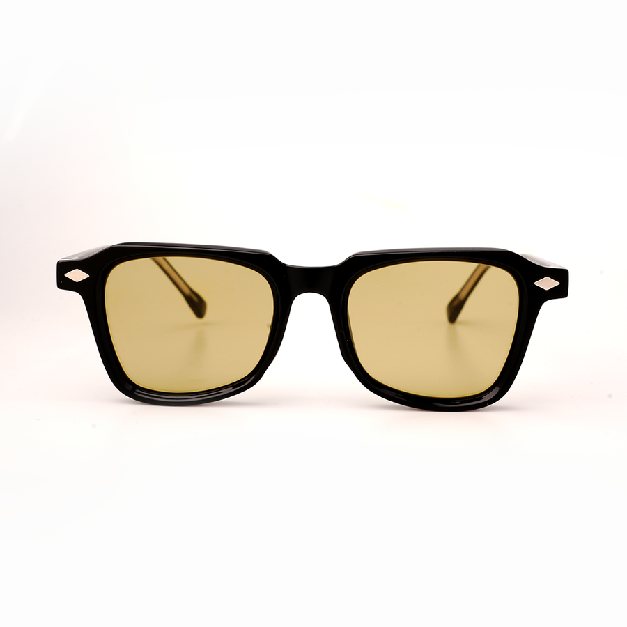 The Noir Amberlite Edition brings together a sleek black PC frame with warm yellow-tinted lenses, designed for effortless day-to-night wear. The distinctive diamond-cut rivet accents enhance its luxury character, while the amberlite lenses add a retro-inspired edge with practical glare reduction.