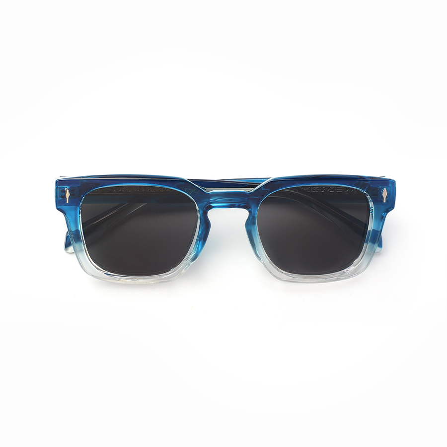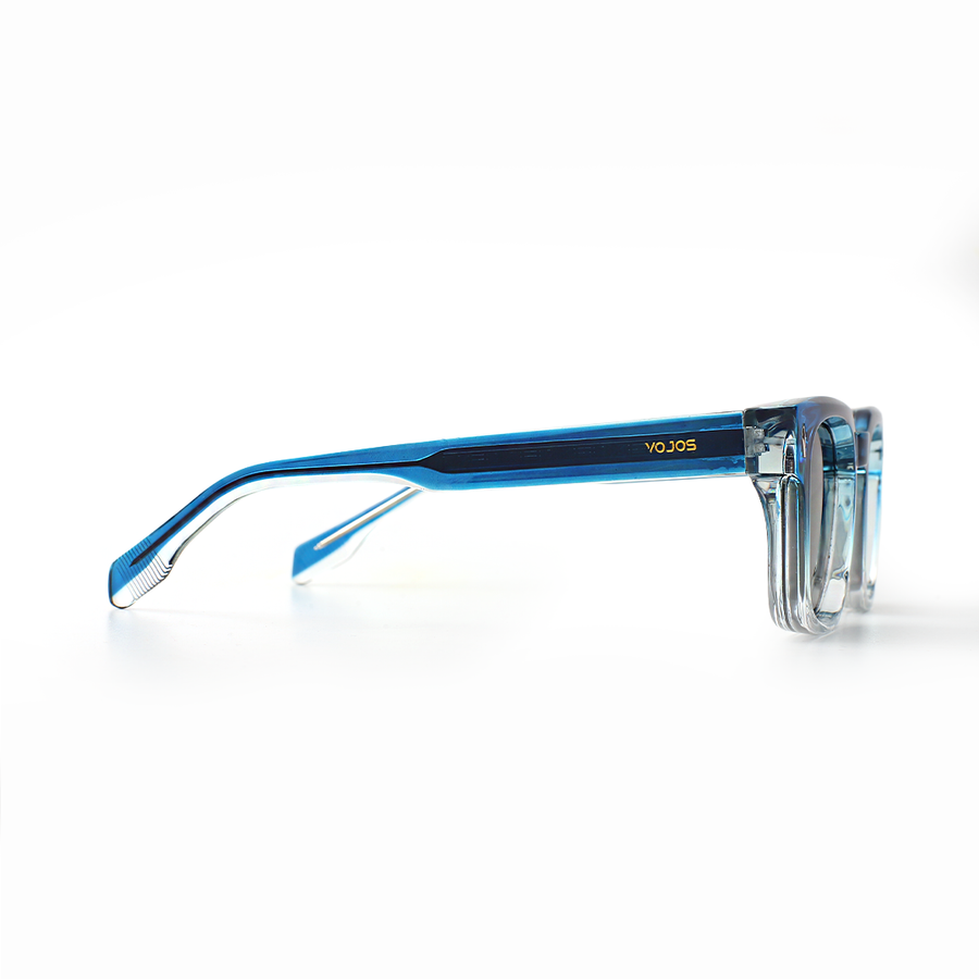 The Fade Tide Edition captures the essence of coastal sophistication. With its striking blue-to-clear gradient frame, this piece mirrors the calm transition of ocean waves meeting the shore. Paired with sleek grey lenses, the square silhouette offers a confident yet refreshing statement, making it the perfect eyewear for bold personalities who love to stand out. Finished with the engraved VOJOS eagle emblem, it represents both elegance and strength.